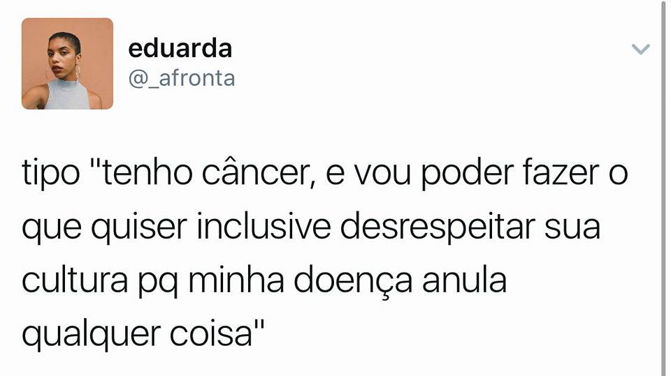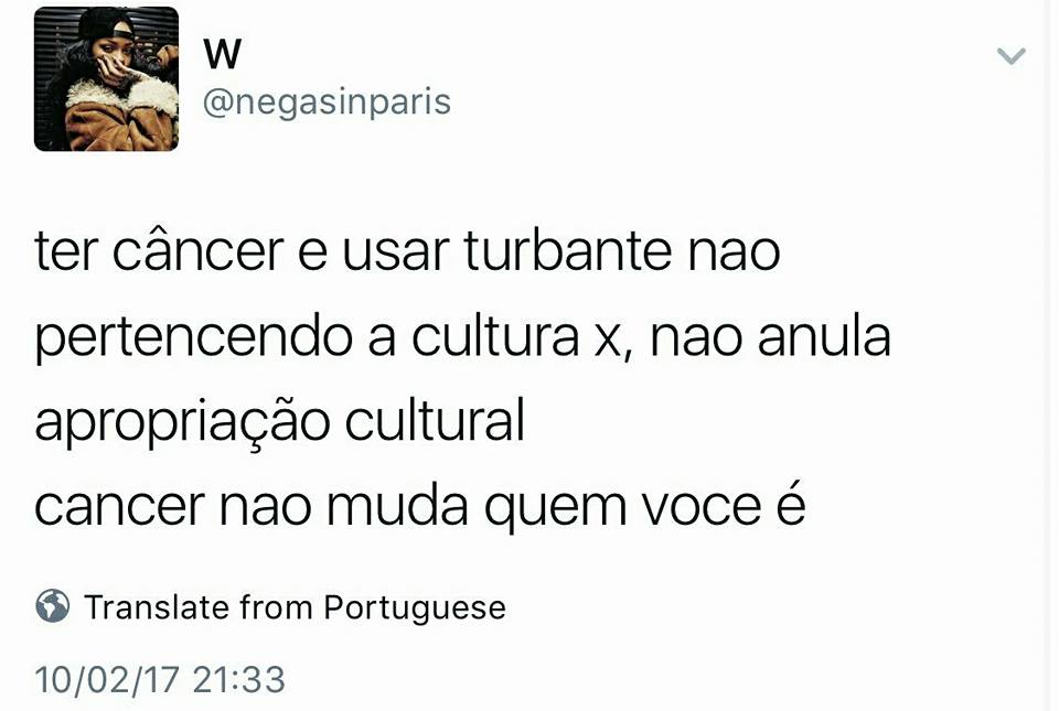 Apesar de ter indignado muitas pessoas em relação à estupidez de quem acredita na ideia de que culturas de minorias são “roubadas” por brancos ocidentais, o relato também ajudou a tirar a máscara de justiceiros sociais que escondem um racismo velado. Mesmo com o fato de que o turbante estava sendo usado por causa de uma doença, ainda houve quem argumentasse que “câncer não é desculpa para se apropriar da cultura negra”, entre outras idiotices, como é possível ver nos prints abaixo: